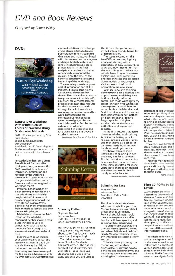 The Journal for Weavers, Spinners & Dyers, the official magazine for the Association of Guilds for Weavers, Spinners & Dyers (UK), featured a glowing review of our DVD in the current Spring 2012 issue (issue 241, p 41). Sincere thanks to Jane Deane, Peter Tavy, and Dawn Willey for including our DVD in your publication.