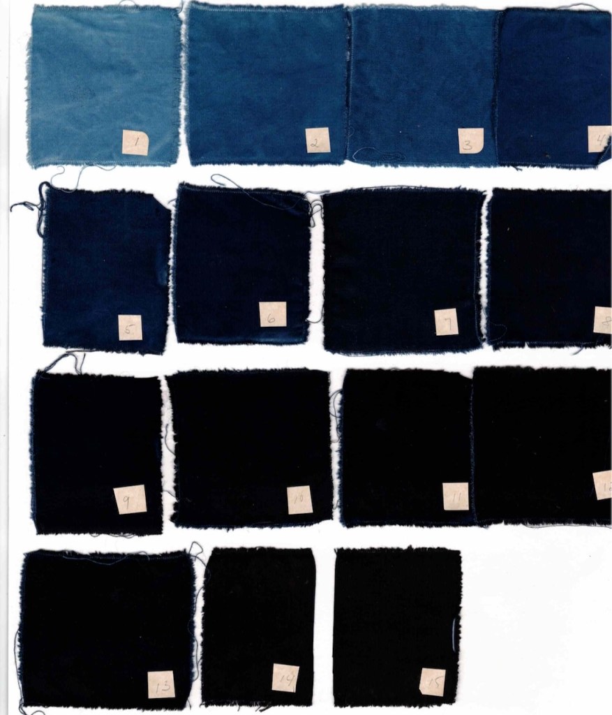 Indigo on cotton cloth: 1-15 ten-minute dips. May 2020